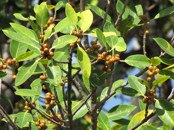 - Yellow orange strangler fig fruit surrounded by green leaves on branches