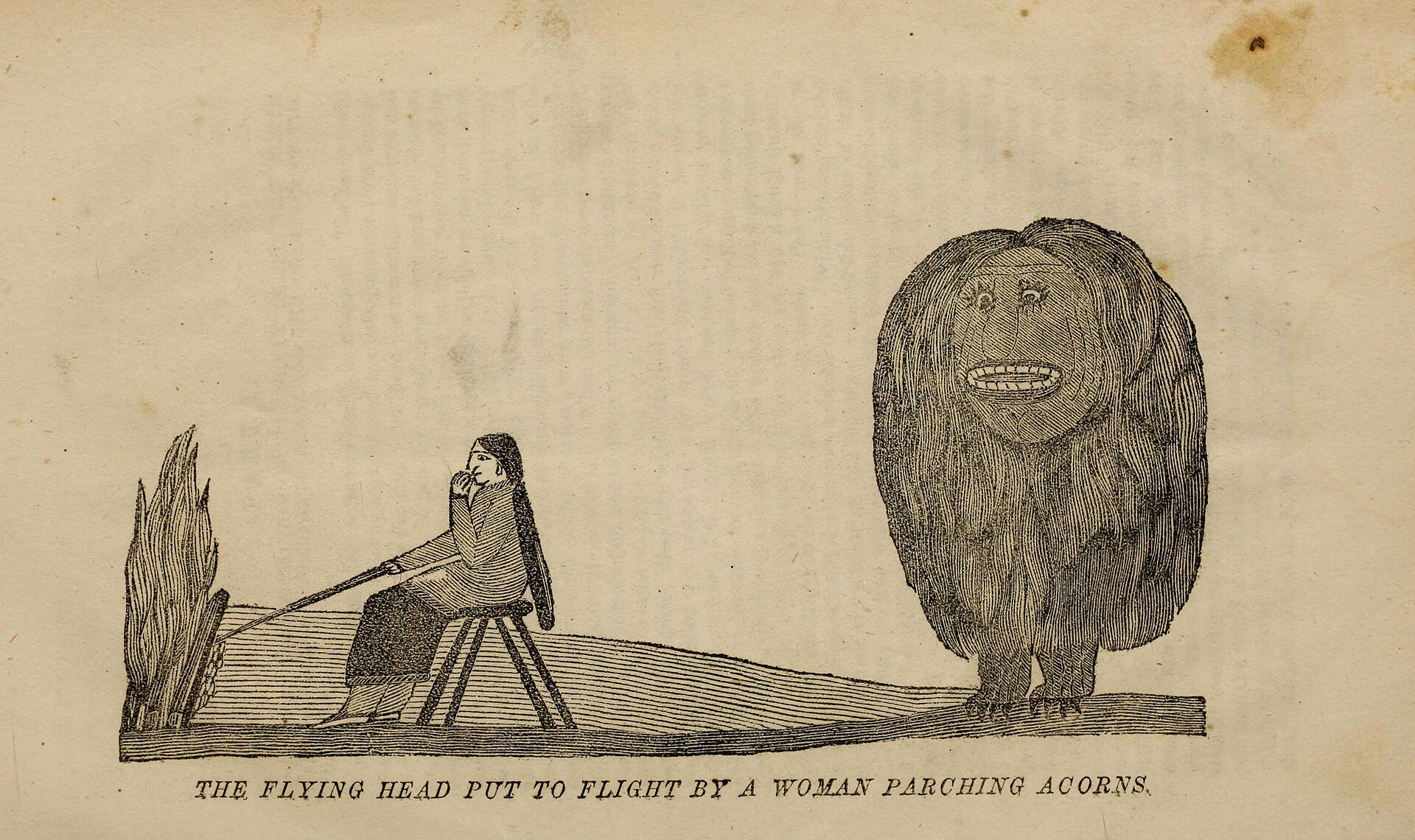 - The Flying Head comes from the mythology of the Haudenosaunee and Wyandot peoples; particularly the region near the source of the Hudson River and the Adirondack Mountains. The Flying Head is malevolent entity, described as a grotesque manifestation with features like a human head, long hair, and eyes that strike terror to witnesses. Its mouth is filled with razor-sharp fangs, and sometimes, it has bat-like wings protruding from its cheeks or bird-like talons. Legends present it as larger than any man and with an impenetrable hide.